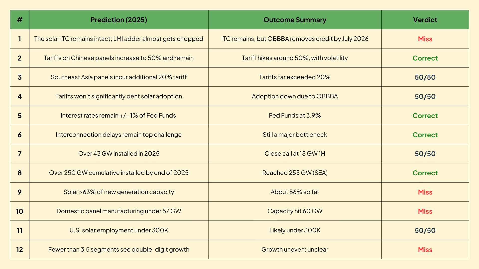 What the market taught us in 2025 is that perspective is informed by experience. Last year, we published a set of predictions about where the solar market was headed. Some held. Many didn’t. And that outcome is instructive.